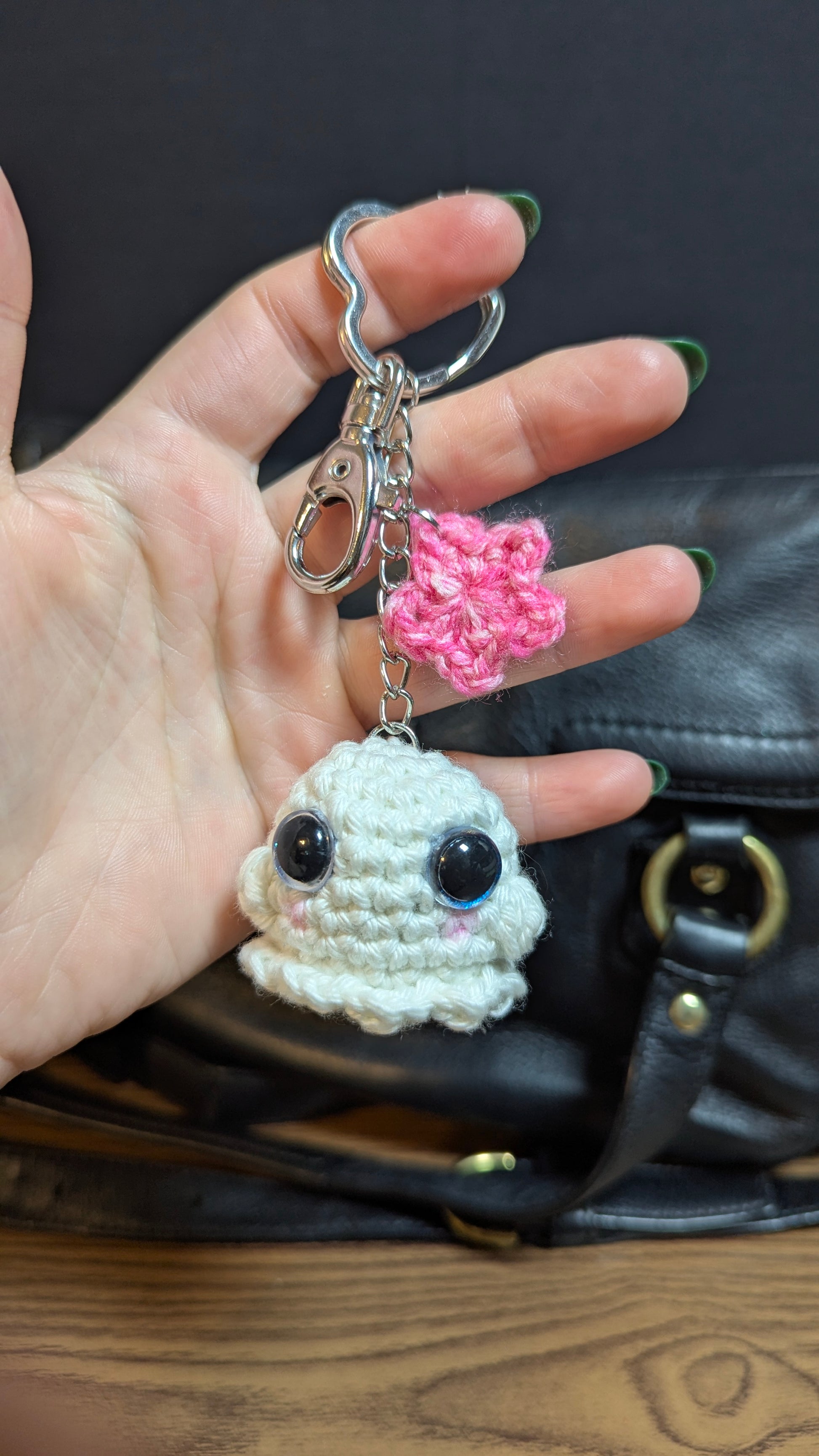 A little spooky, a lot cute—this handmade crochet ghost bag charm is ready to tag along on your daily adventures. Made with glow-in-the-dark yarn, it’s a charming blend of ghostly fun and nighttime magic. The friendliest haunting you’ll ever carry.