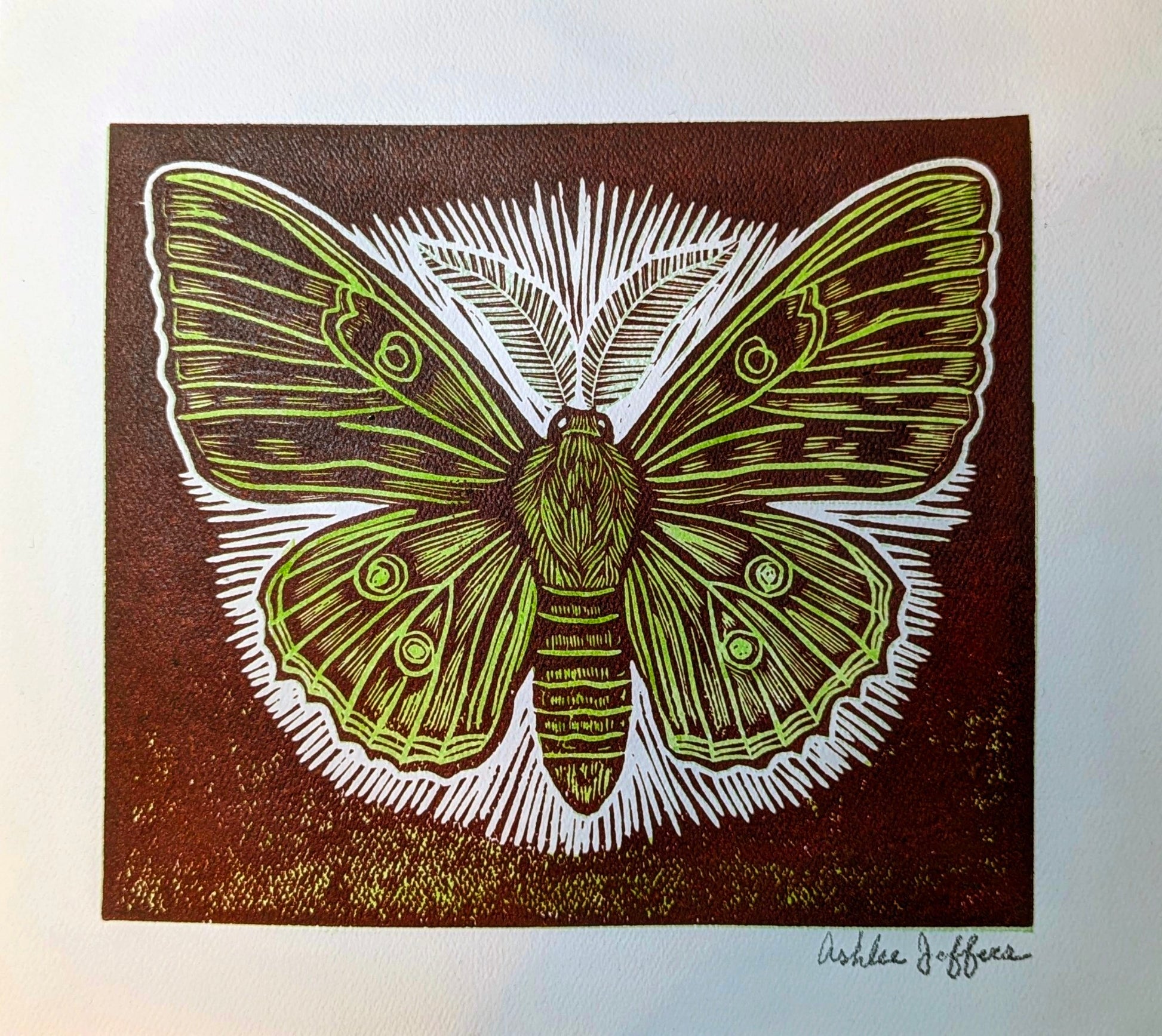 Striking yet delicate, this 2-layer reduction print captures the quiet beauty of a moth in bold, unexpected color. A vibrant chartreuse forms the body and wings, glowing against a deep, iron-red background that gives the piece a warm, vintage feel—like a forgotten specimen card from another time.