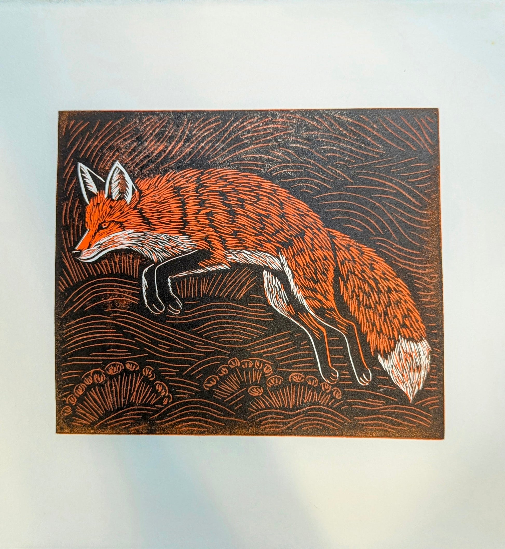 A fleeting moment captured in carved lines and layered color — this 3-layer reduction block print features a fox mid-leap, darting through a dense thicket as the first light of dawn breaks. Rich orange tones wash the scene in early morning glow, casting long shadows and evoking the quiet, wild stillness of nature waking up.